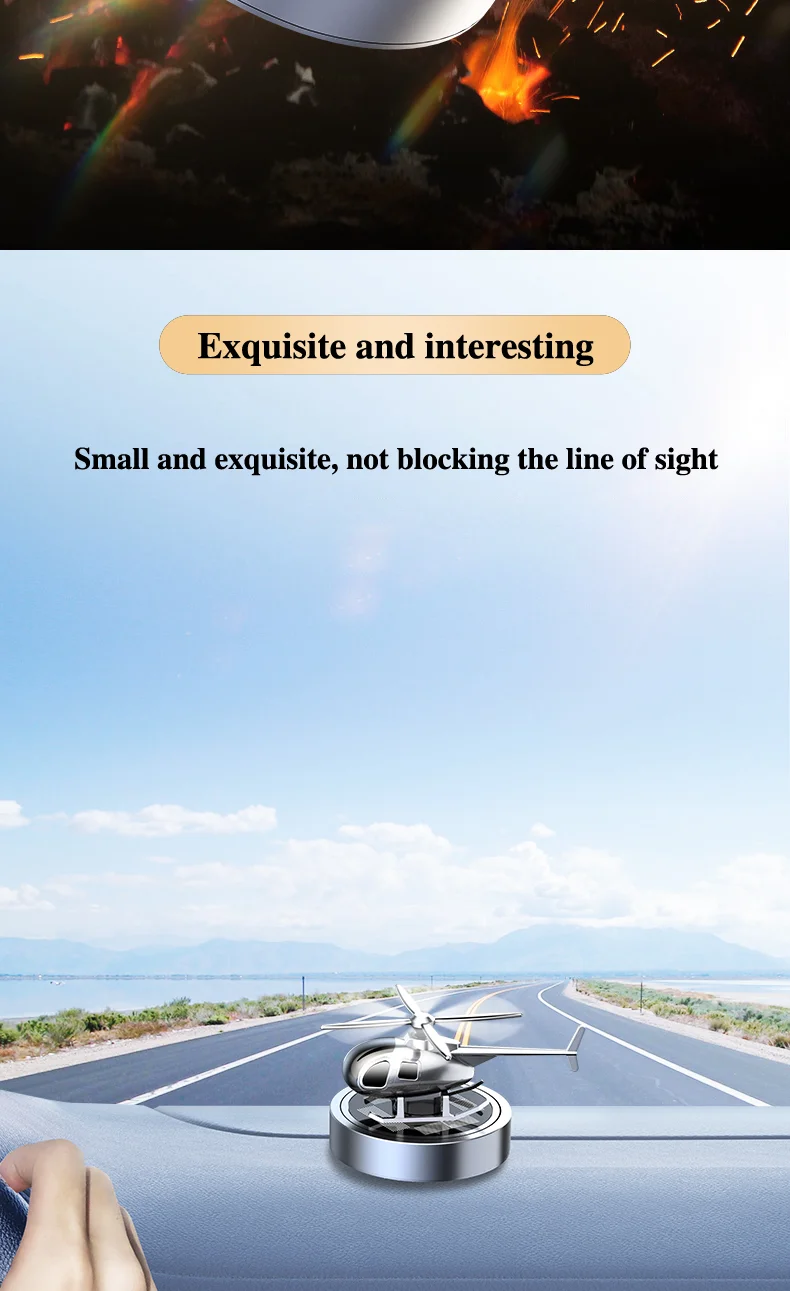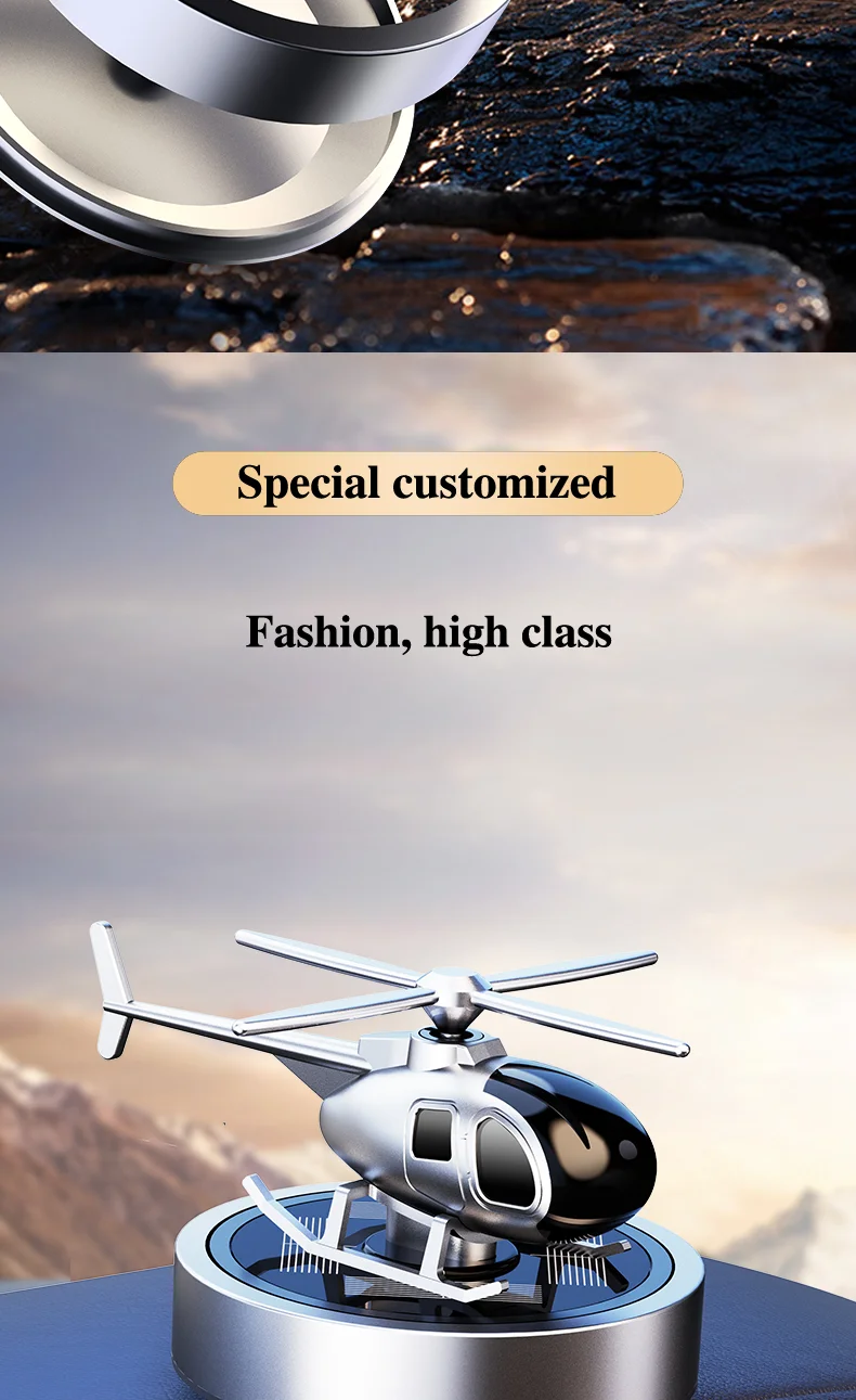 Upgrade your car accessories with the Solar-Powered Helicopter Car Air Freshener and enjoy a unique blend of style, sustainability, and personalization. Perfect for car enthusiasts, gift-givers, or anyone looking to add a touch of whimsy to their daily commute!