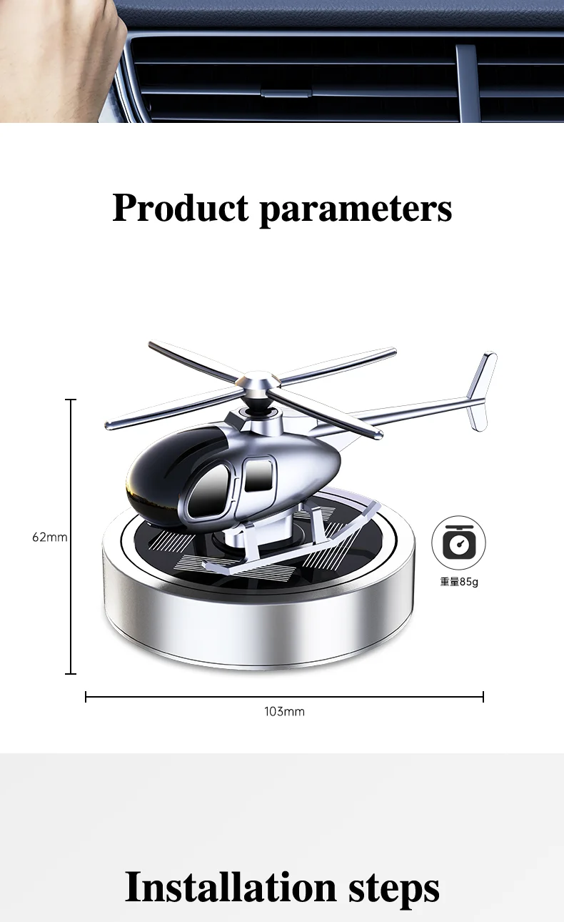 Crafted from high-quality plastic and alloy materials, the Solar Helicopter Air Freshener is durable and built to last. Measuring 103mm in length, 70mm in width, and 62mm in height, its compact size makes it easy to fit in any car interior without taking up too much space. Weighing only 250 grams, it’s lightweight and easy to install.