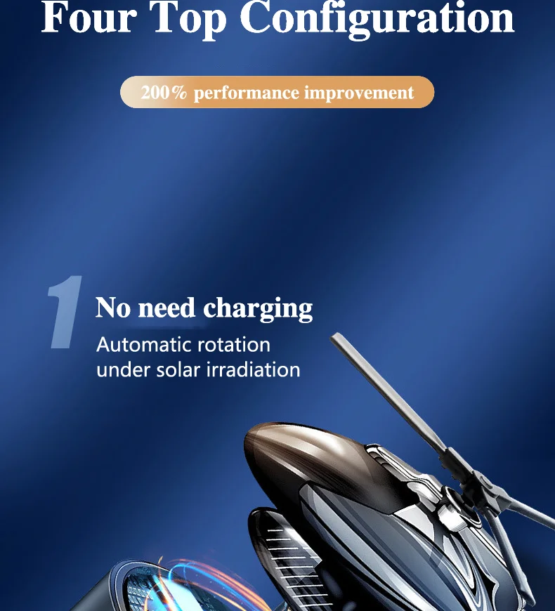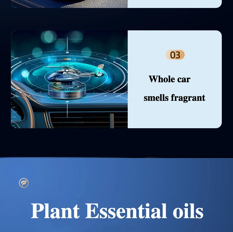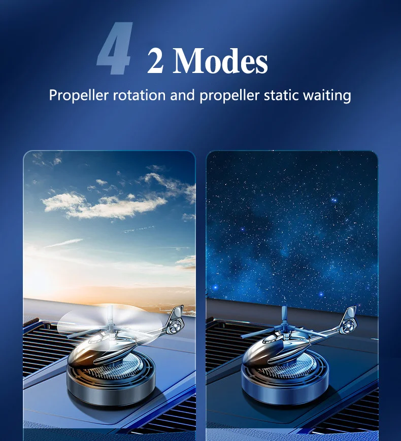 Introducing the Solar-Powered Helicopter Propeller Car Air Freshener, the perfect blend of style and functionality for your vehicle! This innovative air freshener not only enhances your car's ambiance with delightful scents but also serves as a unique interior accessory that will catch the attention of your passengers. With its rotating helicopter propeller design, it adds a playful touch to your dashboard while efficiently diffusing your favorite fragrances throughout the car.