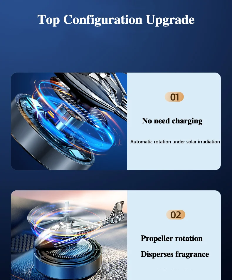 Powered by solar energy, this eco-friendly air freshener eliminates the need for batteries or electricity, making it a sustainable choice for the environmentally conscious driver. Simply place it on your dashboard, and let the sun do the work! The gentle rotation of the propeller creates a soothing visual effect, while the built-in perfume diffuser ensures that your car smells fresh and inviting at all times.