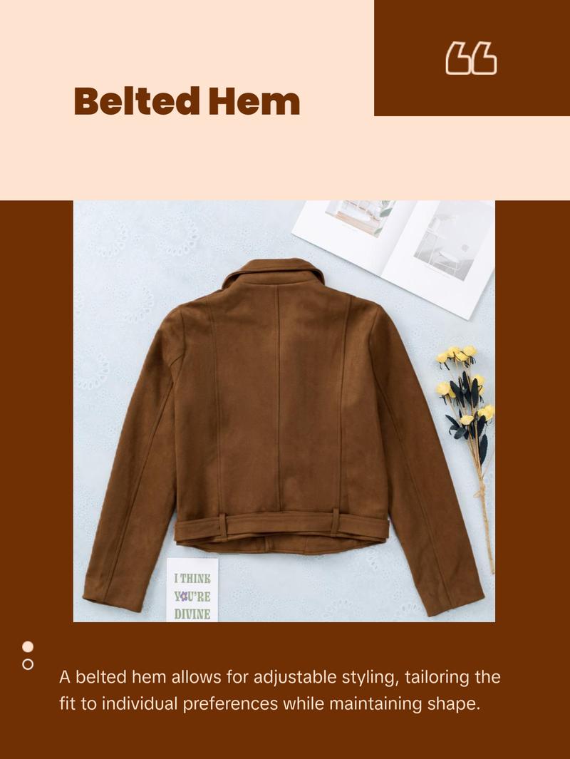 - Featuring an asymmetrical front zippered bodice, this jacket not only stands out but also offers a secure fit, while the belted hem enhances your silhouette.
